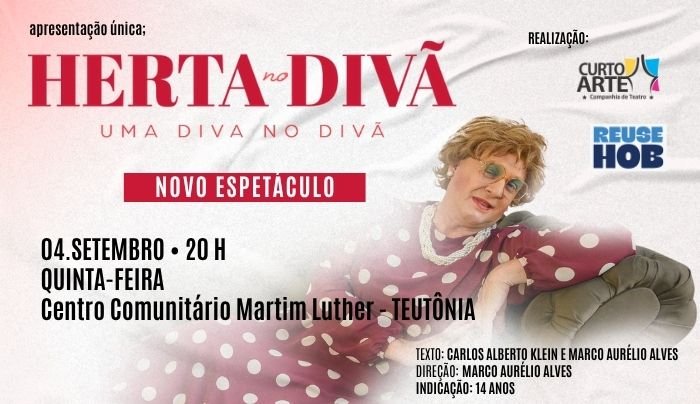 O diretor Carlos Alberto Klein estreia “Herta no Divã “. Betinho, como é conhecido o diretor e também intérprete da Herta, personagem com mais de 70 anos de idade, a queríííta Herta, mais do que nunca, se permite buscar a felicidade, enfrentando seus conflitos e ultrapassando todos os desafios. Herta apresenta ao público, de uma forma bem-humorada, uma reflexão sobre o autocuidado, se permitir estar no Divã.