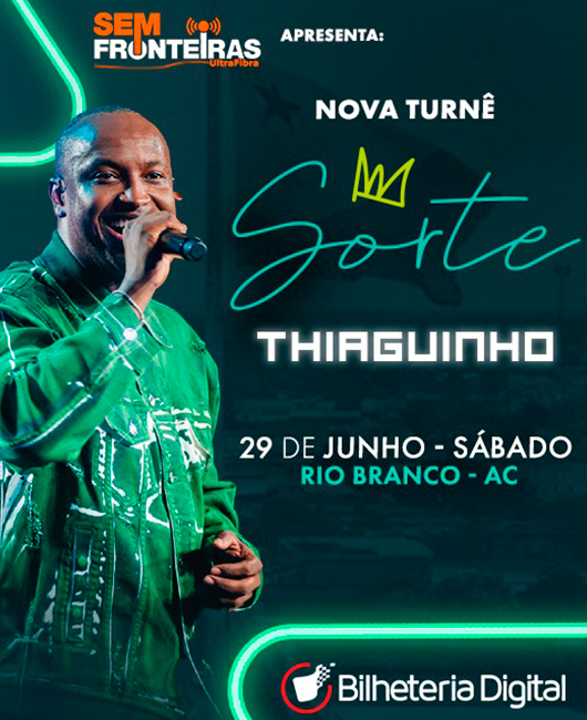 Atenção, fãs de Thiaguinho! 📣🔥🚀 Marquem na agenda! Dia 30/06/2024, o pagodeiro mais amado do Brasil se apresenta em Rio Branco com sua nova turnê 'Sorte'. Thiaguinho, icônico artista da música nacional, traz seus grandes hits que agitaram as ondas do rádio e das plataformas de streaming.